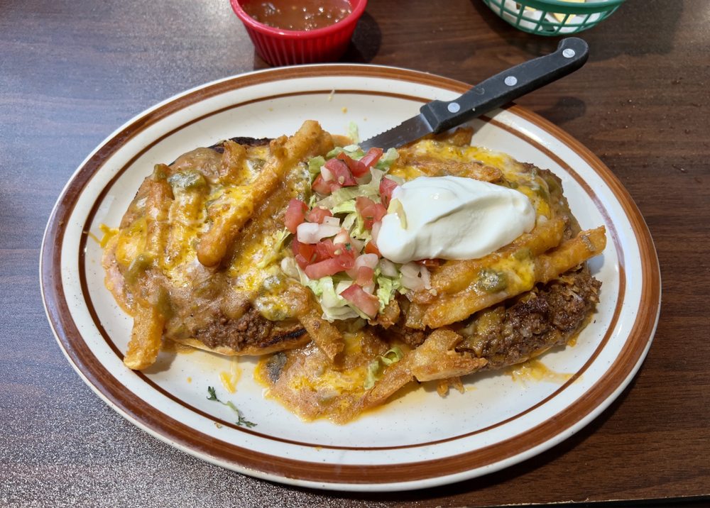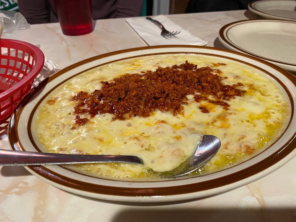 Chorizo, onions, peppers, cheese, and smothered with Green Chili,