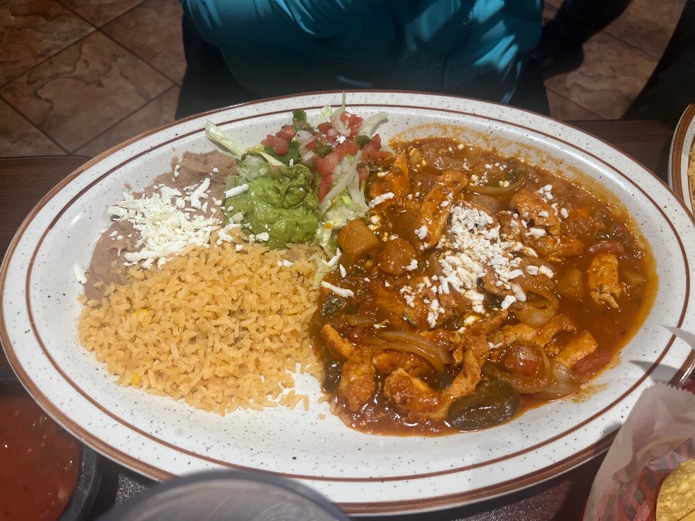 Grilled chicken cooked in our house ranchero sauce. Served with Rice and beans