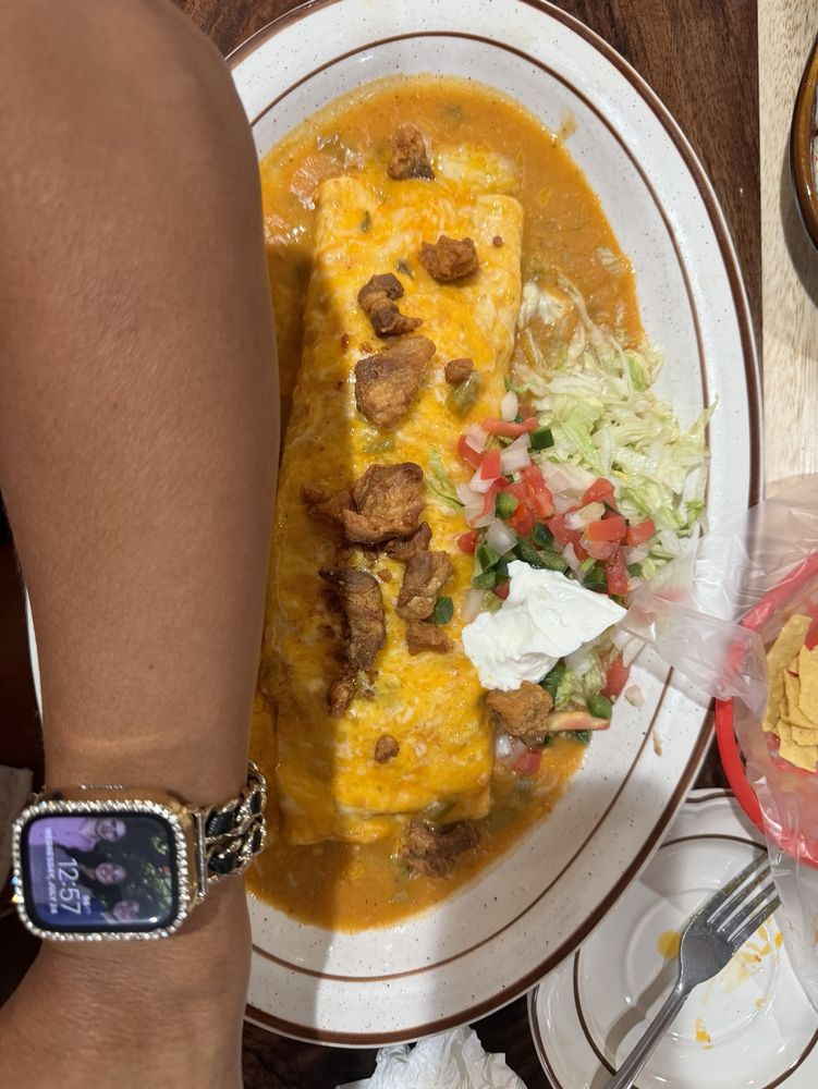 (3) Enchiladas filled with choice of cheese, ground beef, shredded chicken, or shredded beef. Served with Rice & Beans